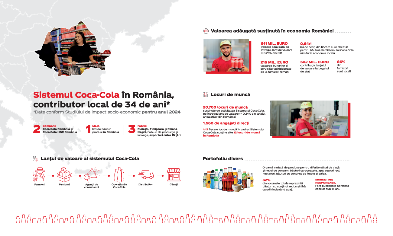 Prezent în România de 34 de ani, Sistemul Coca-Cola funcționează prin două companii partenere, cu activități complementare, ce asigură toate elementele necesare producerii și distribuției către consumatori a unui portofoliu divers de băuturi și a unor mărci iubite de români: